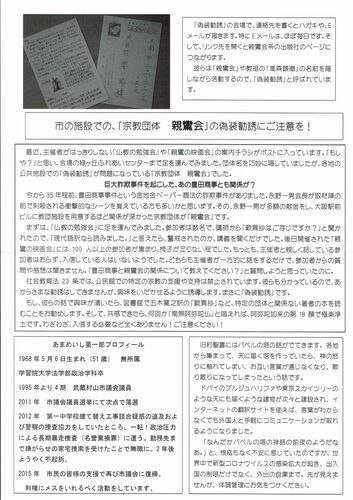 活動報告の裏面です。武蔵村山市内の公共施設で、「カルト教団 親鸞会」が団体名を隠して偽装勧誘している実態をレポートしました。 新型コロナで市の施設が使用できなくなり、隔世の感があります。カルト教団が集会を開けない、この期間に多くの人の洗脳が…